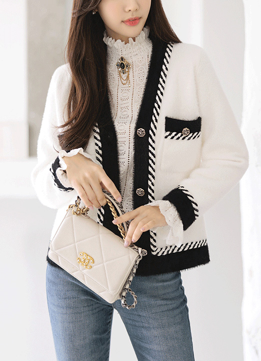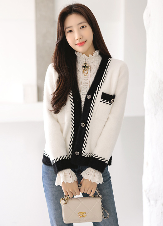 ローズボタン配色トリムフェイクアンゴラニットカーディガン cd28926