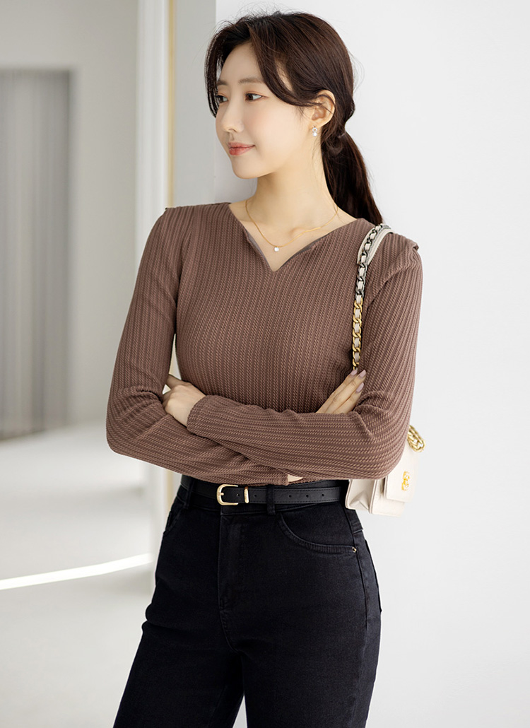 브이넥으로 트여 페미닌한 실루엣을 연출해주며