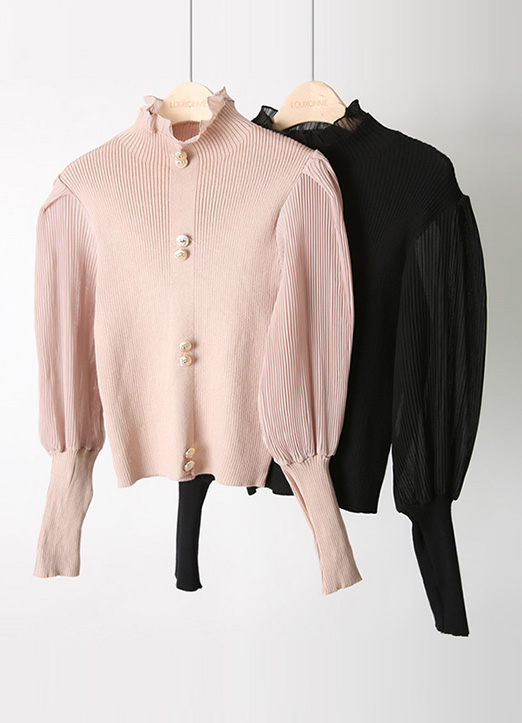 여리여리~ 잔잔한 플리츠 쉬폰 슬리브 배색이 여성스러운 실루엣을 연출해