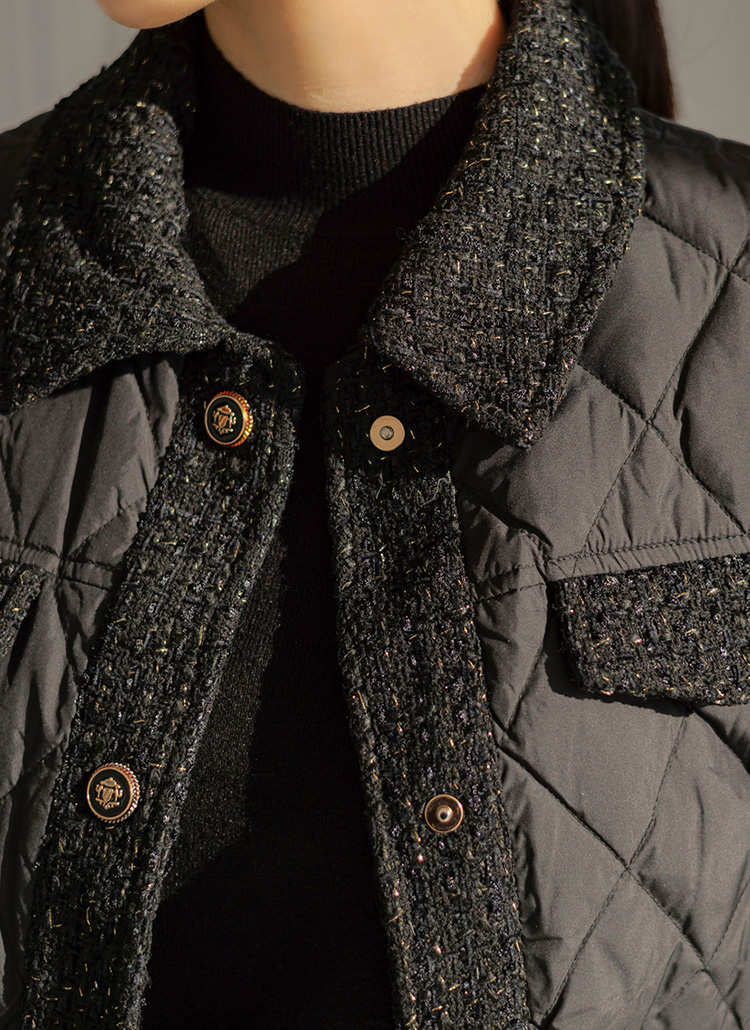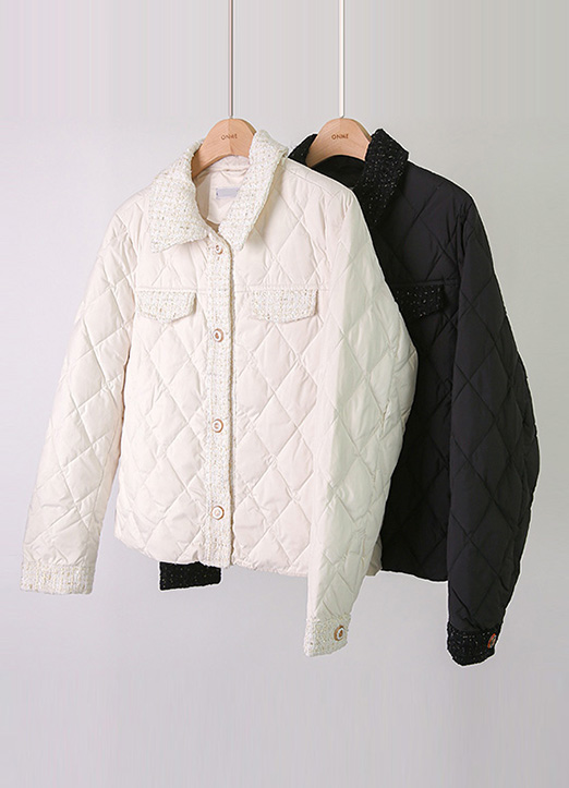 투박할 수 있는 패딩 점퍼에 트위드 배색을 더해