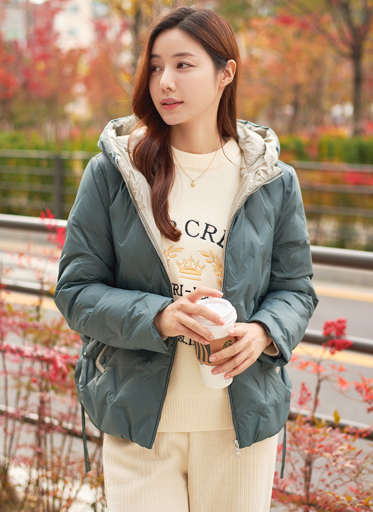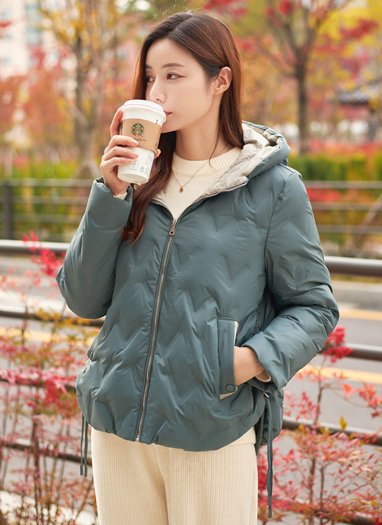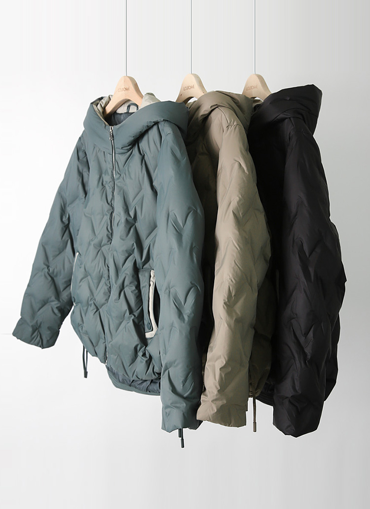 ダイヤ柄キルティングバイカラーフード付きダウンジャケット jp30428