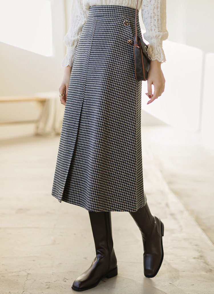 [LouisAngel] ビジューボタン千鳥格子フロントスリットフレアスカート sk30912