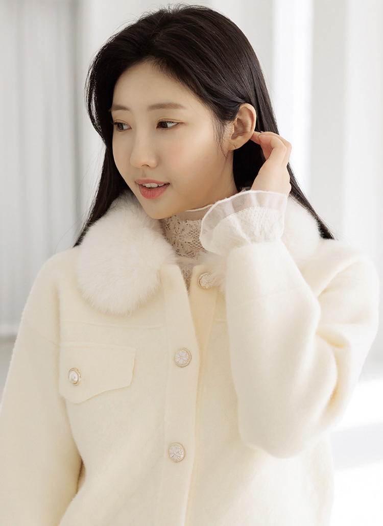 풍성한 퍼 카라 디자인이 얼굴을 화사하게 밝혀주면서