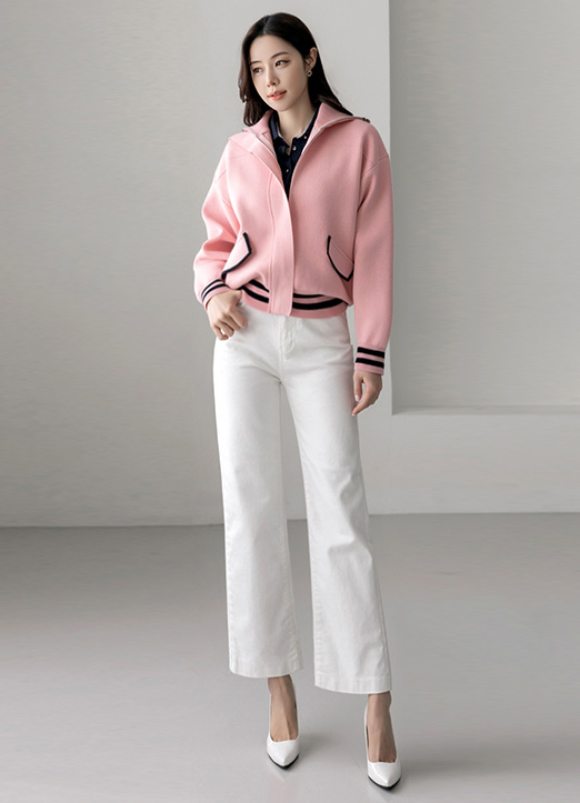 하이넥 라인과 밑단 그리고 소맷단까지 시보리를 배색해주어