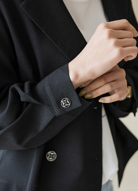 소재와 어울리는 화사한 쥬얼리 버튼을 사용하여 완성도를 높여주었어요.