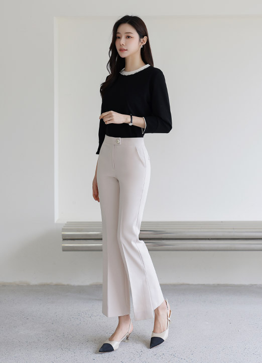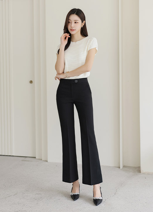 무릎 밑으로는 자연스럽게 퍼지는 부츠컷 라인으로