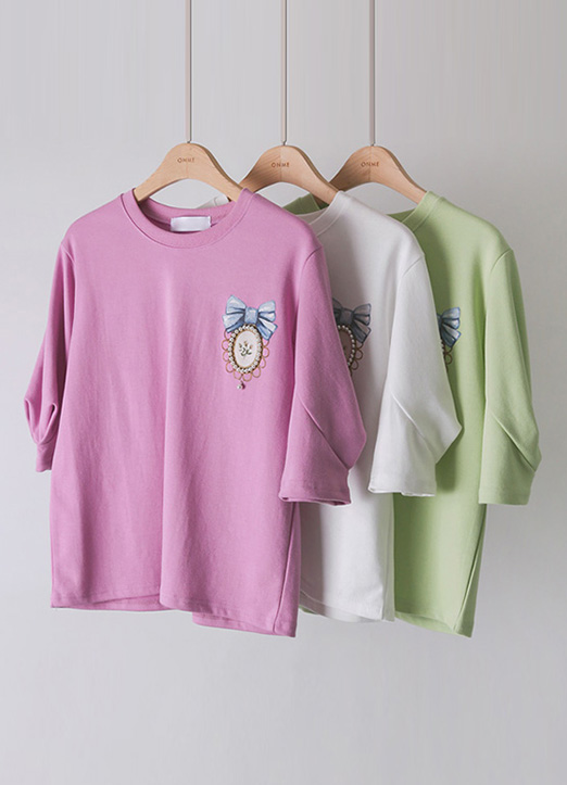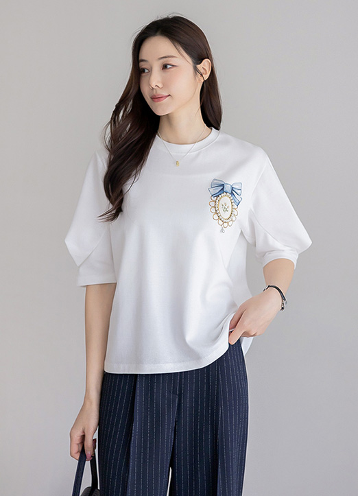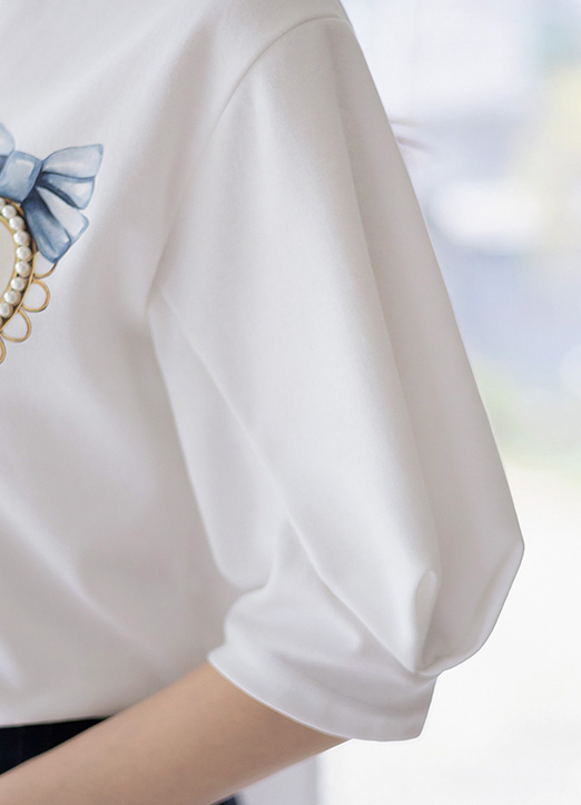 パール付きブローチプリント バルーンスリーブTシャツ ts34253