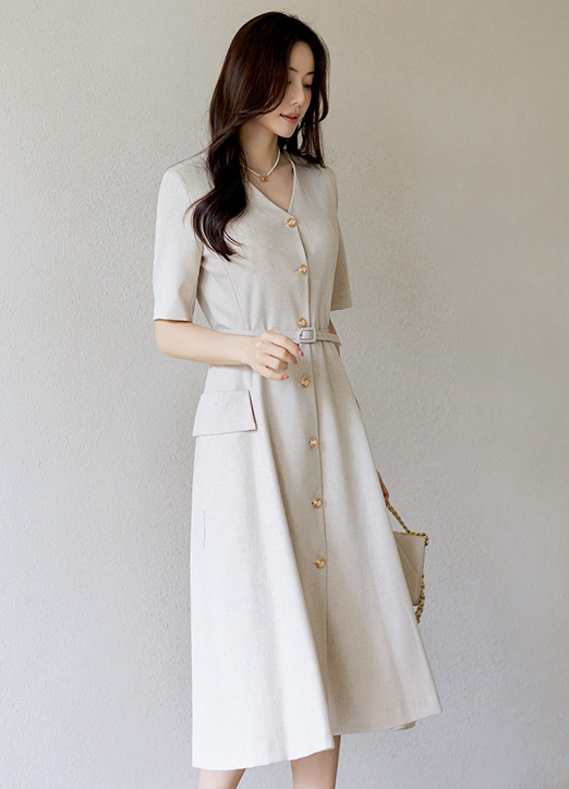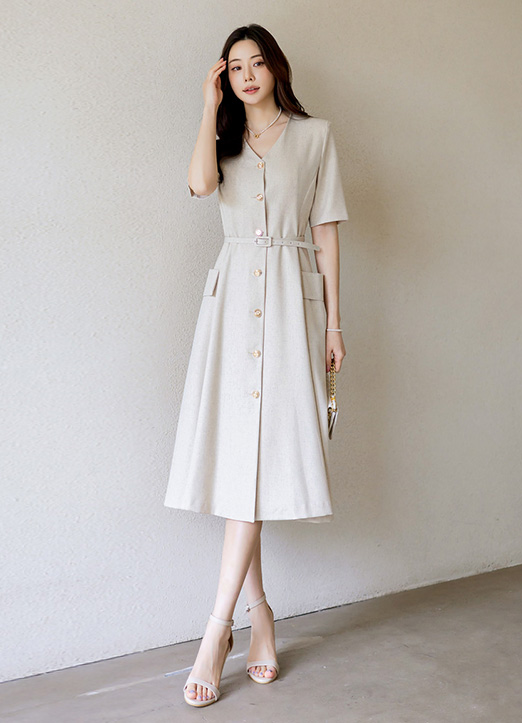ウエストベルトSET リネンブレンド Ⅴネックフレアワンピース op34313