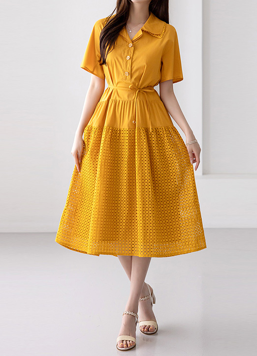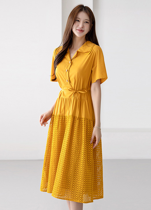 オープンカラー パンチングレース フレアワンピース op34589