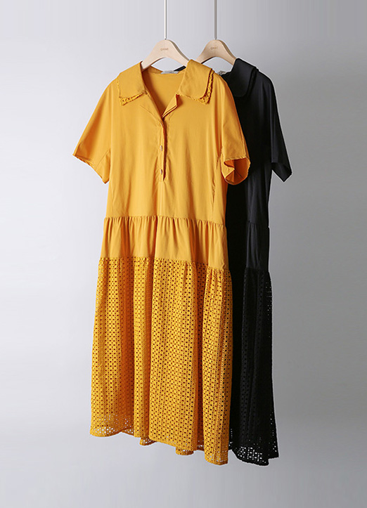 펀칭 아일렛 레이스 배색 A라인 플레어 롱 원피스에요 :)