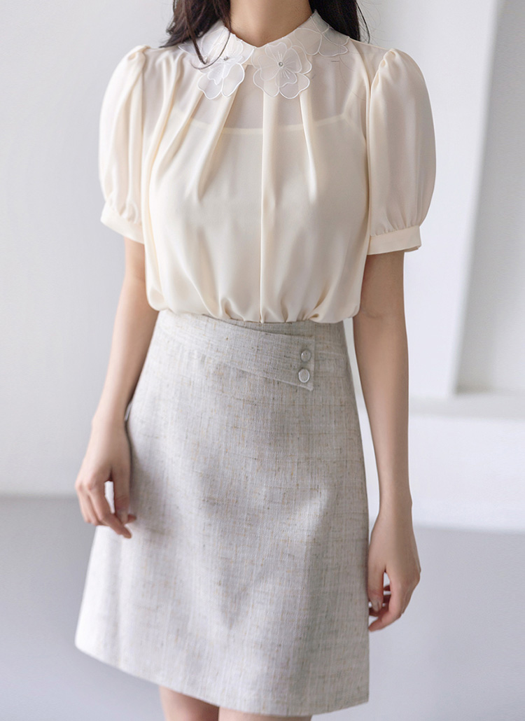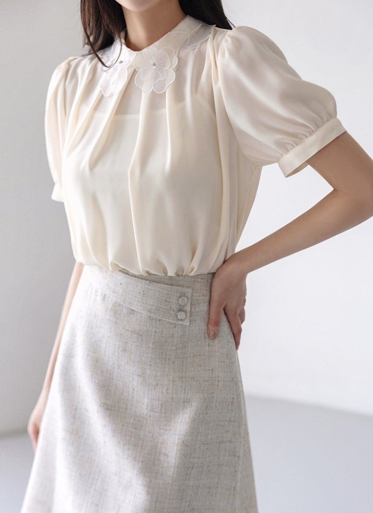 フラワーモチーフレース襟付きシャーリングシアーブラウス bl35057