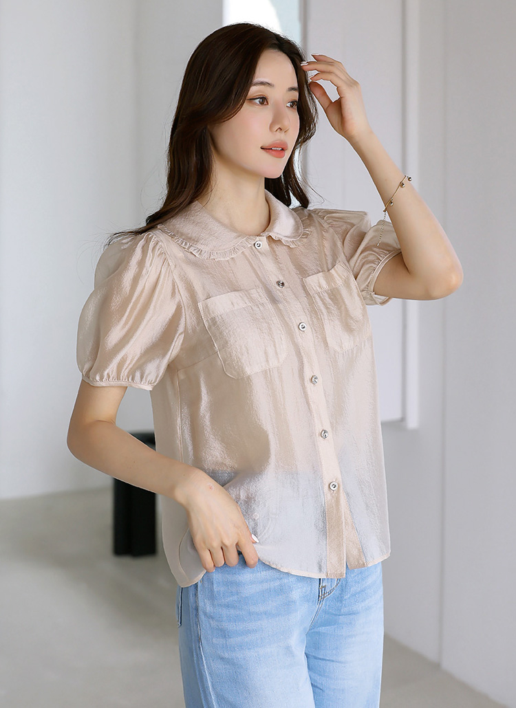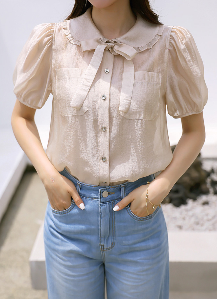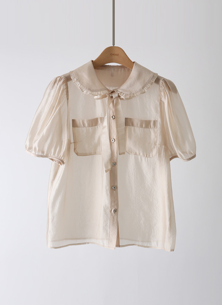 [LouisAngel] リボンタイフリルラウンドカラーシャイニーシアーブラウス bl35430