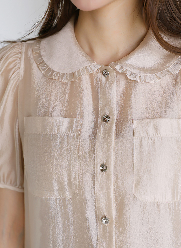 #パフスリーブ #シャイニーサテン #フリルラウンドカラー
