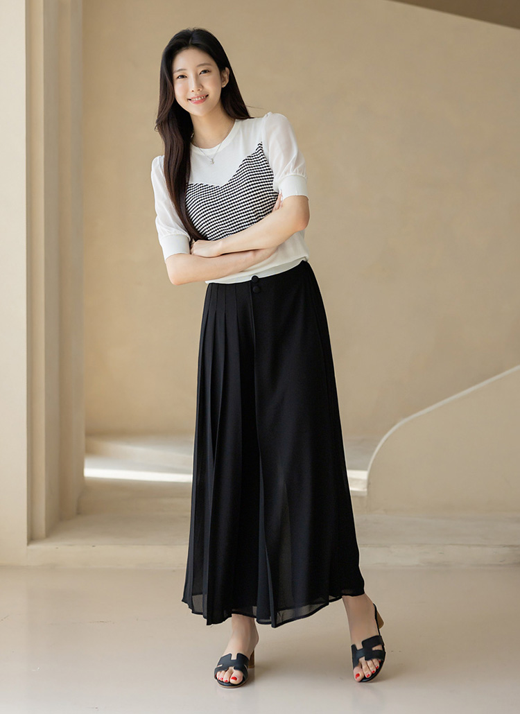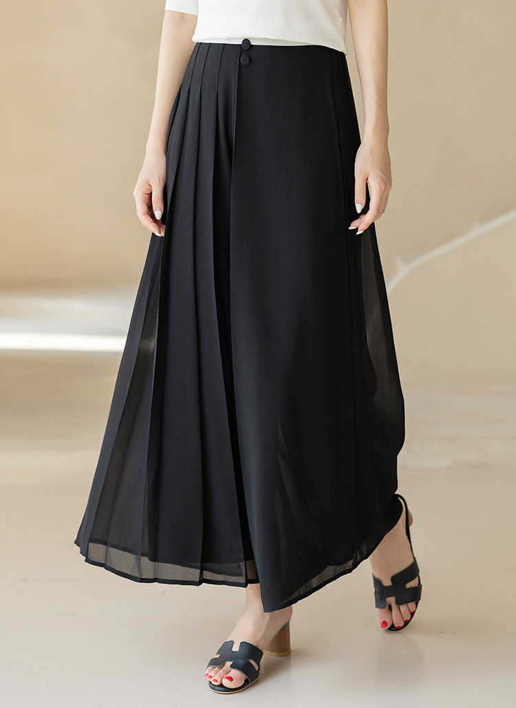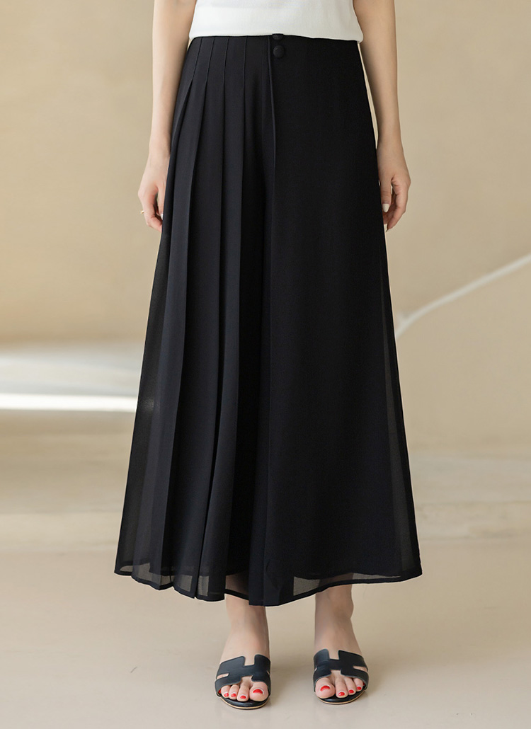 플리츠 디테일이 한쪽에만 가미된 랩 스타일의 와이드 치마바지로