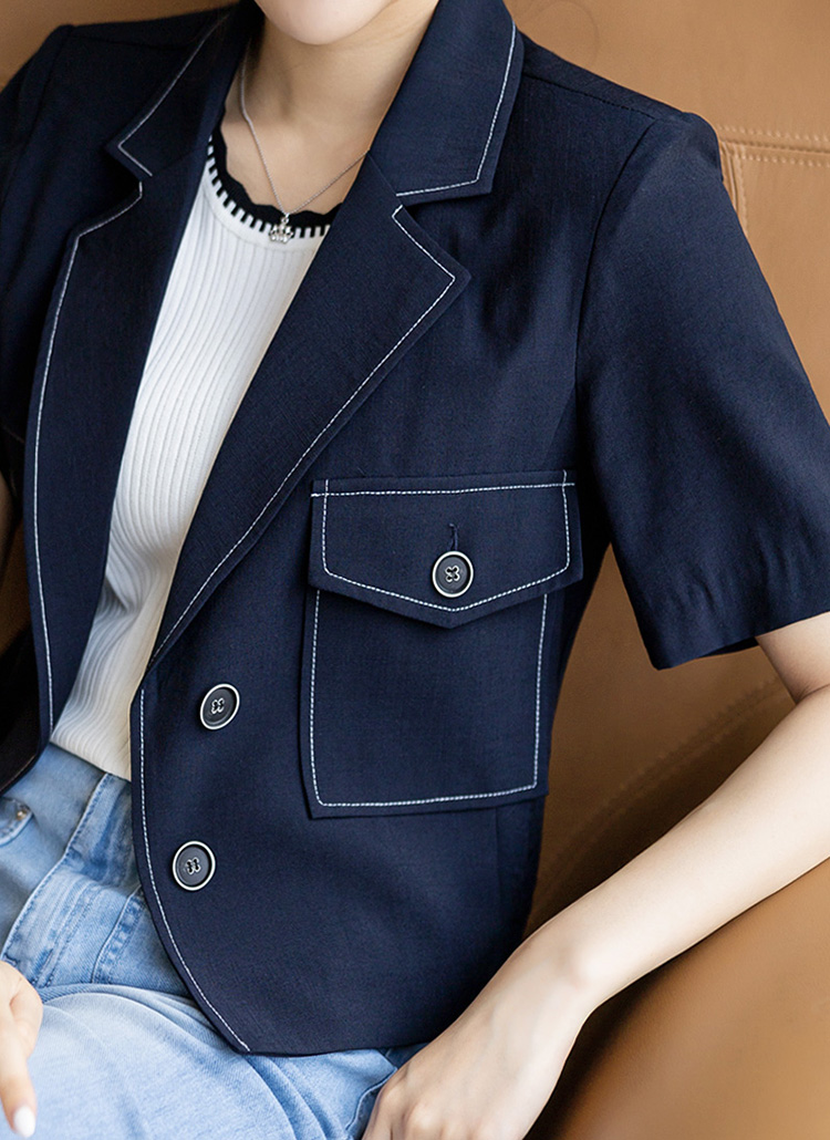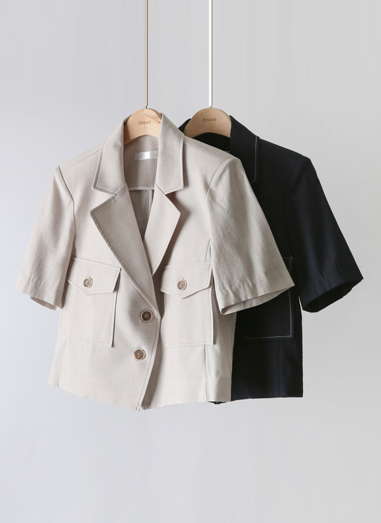 캐주얼한 매력이 돋보이는 세미크롭 반팔 자켓이에요 :)