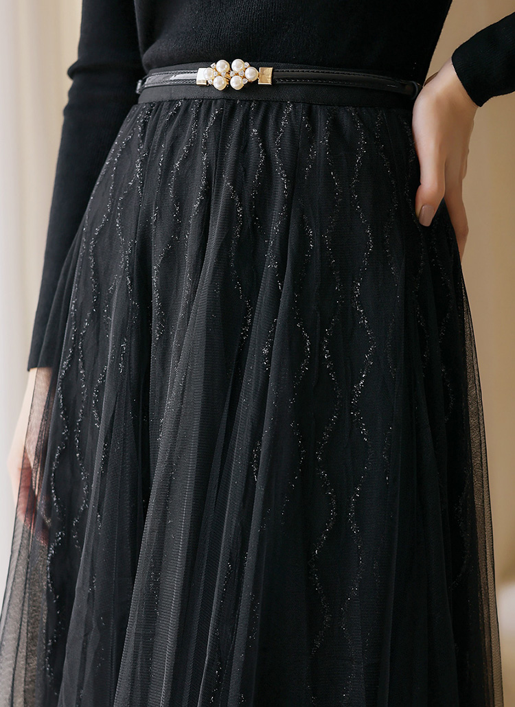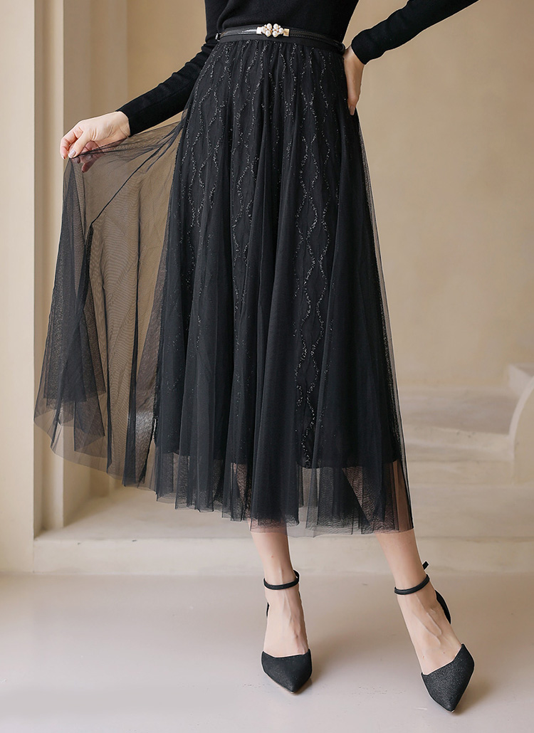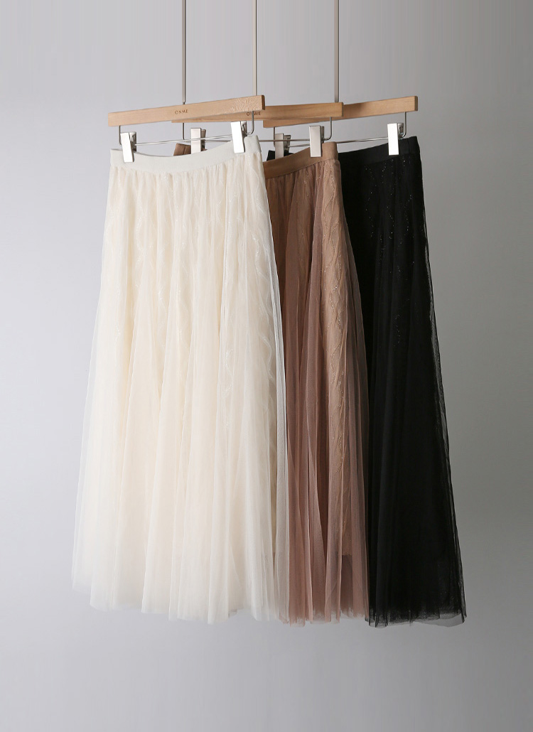 물결 메탈 펄 라인이 돋보이는 레이스 샤 스커트로