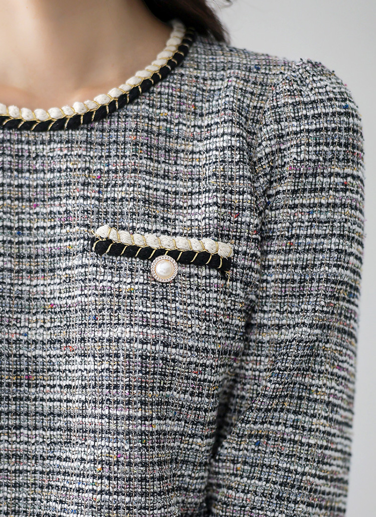 트위드 소재에 배색 꼬임 트리밍으로 페미닌한 매력을 더한