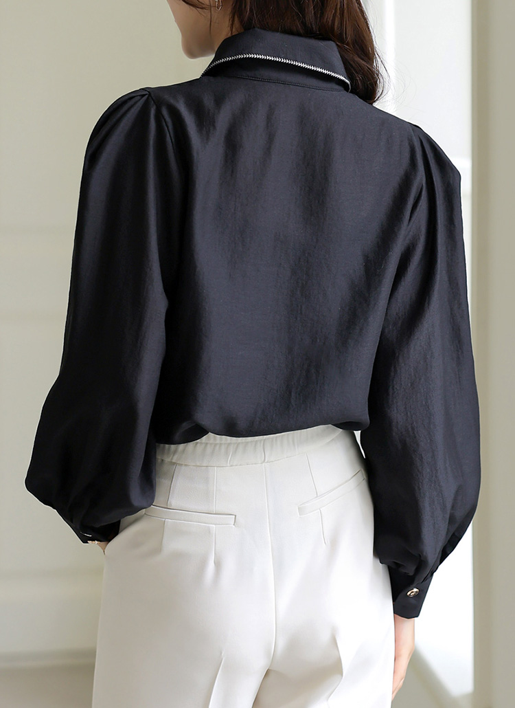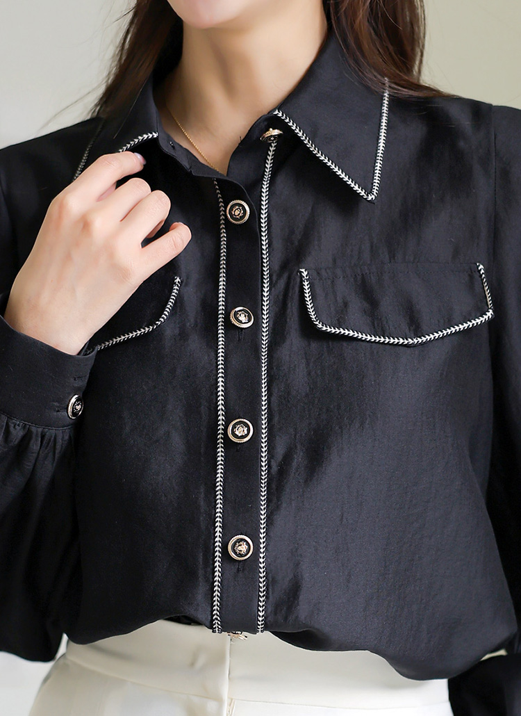 브레이드 라인 디테일이 돋보이는 모달 새틴 블라우스로