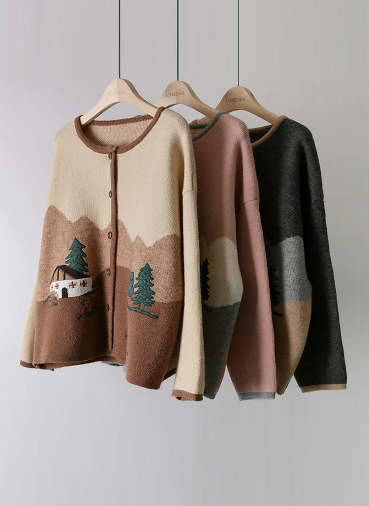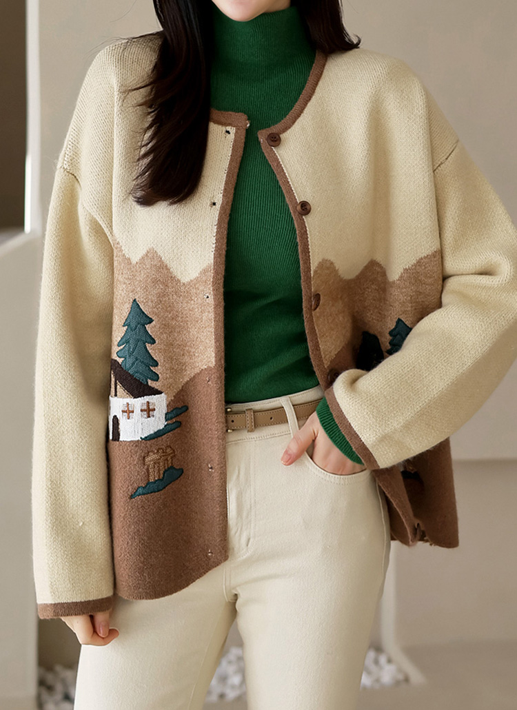 イラスト刺繍ノーカラーニットジャケット cd36965