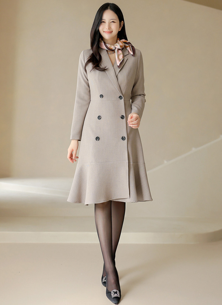 테일러드 카라와 더블버튼으로 클래식한 매력을 더하며
