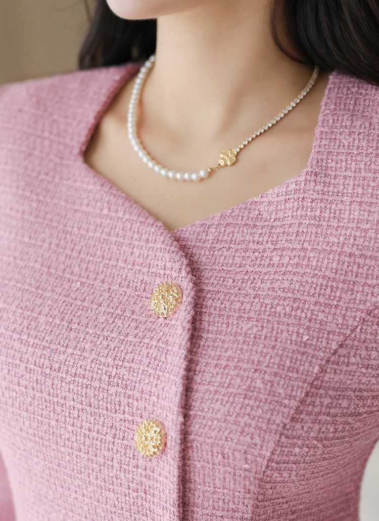 【S/M/L】スクエアネックアシメゴールド釦ラメツイードワンピース op37260