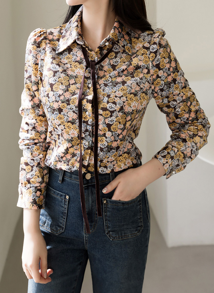 [LouisAngel] リボンタイ付きフラワー柄コーデュロイブラウス bl37272