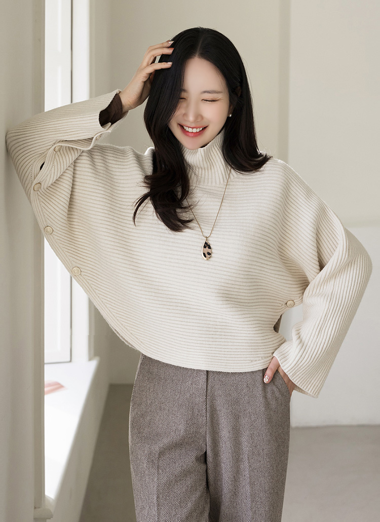 사이드 버튼으로 포인트를 준 가오리 소매 반하이넥 니트에요 :)