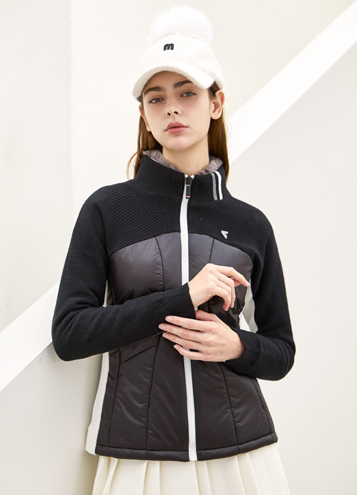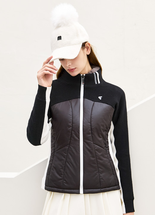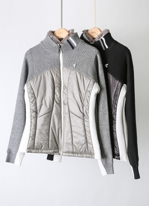 【防風ニット】[QoG] 取り外し可能なファー付きキルティング切り替えニットジップアップ jp37569