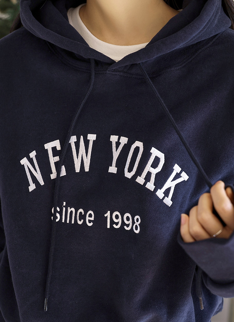 클래식한 레터링 자수가 돋보이는 포근한 양기모 후드티셔츠에요 :)