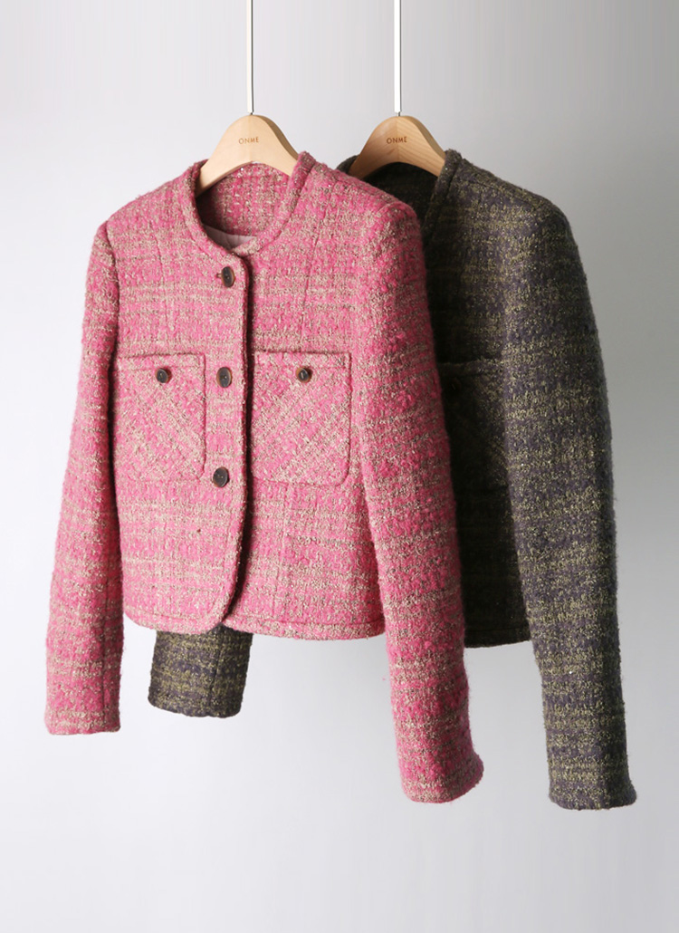 세련된 노카라 디자인에 울 블렌딩 부클 트위드 소재로