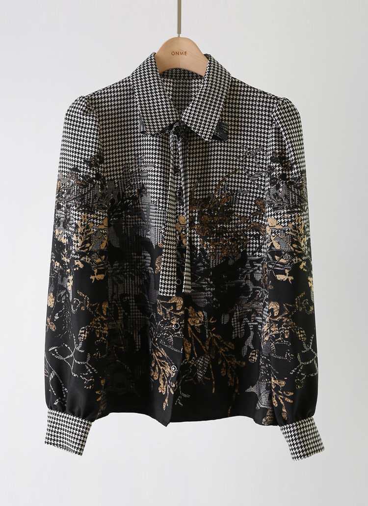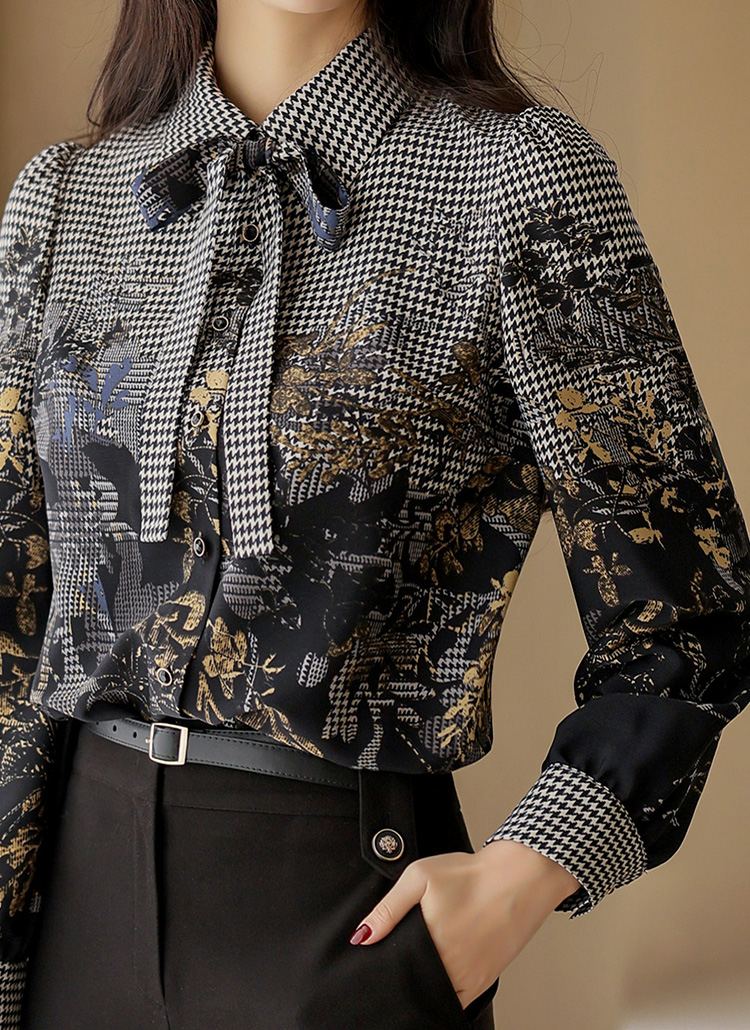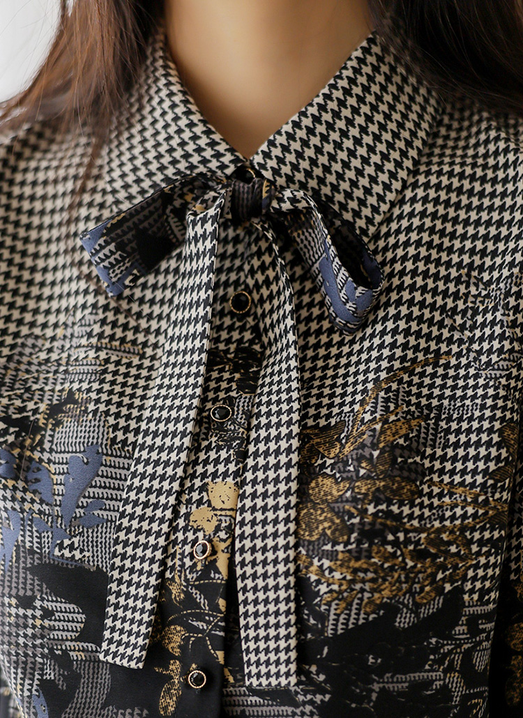 [LouisAngel] リボンタイ付き 千鳥格子リーフプリントブラウス bl38127