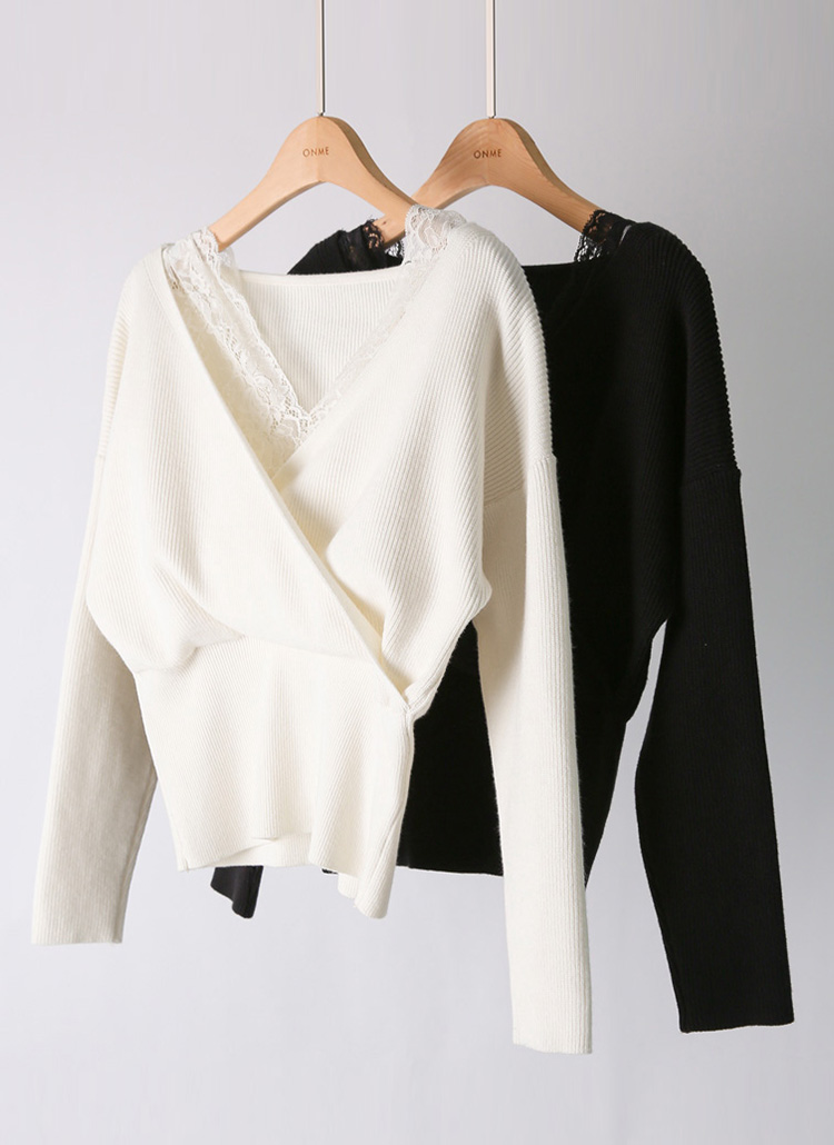 여리여리한 실루엣을 연출해주는 레이스 레이어드 랩 골지 가오리 니트에요 :)
