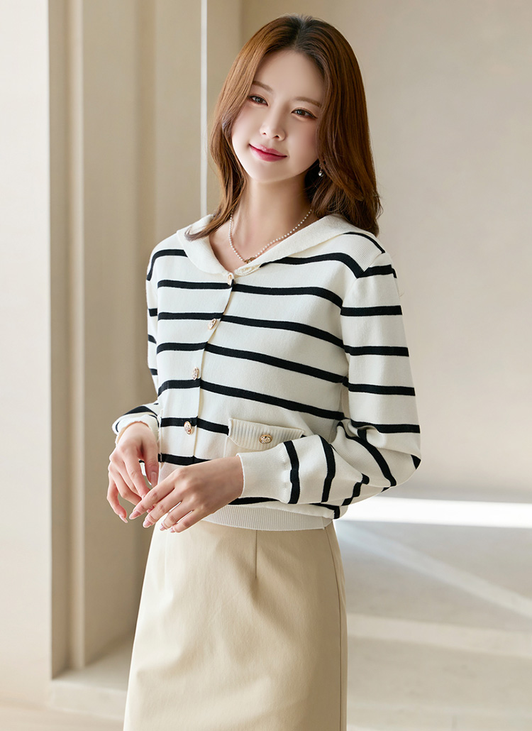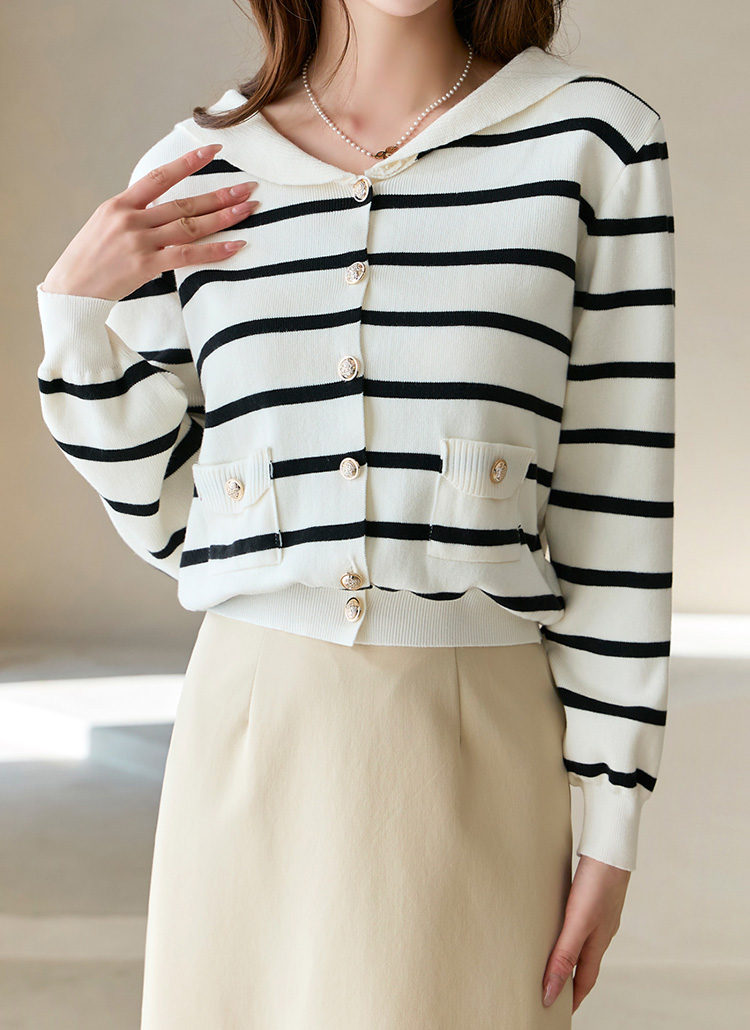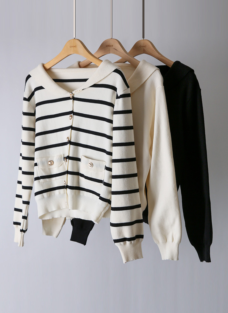 산뜻한 세일러 카라 디자인에 골드 버튼으로 포인트를 준 니트 가디건이에요 :)