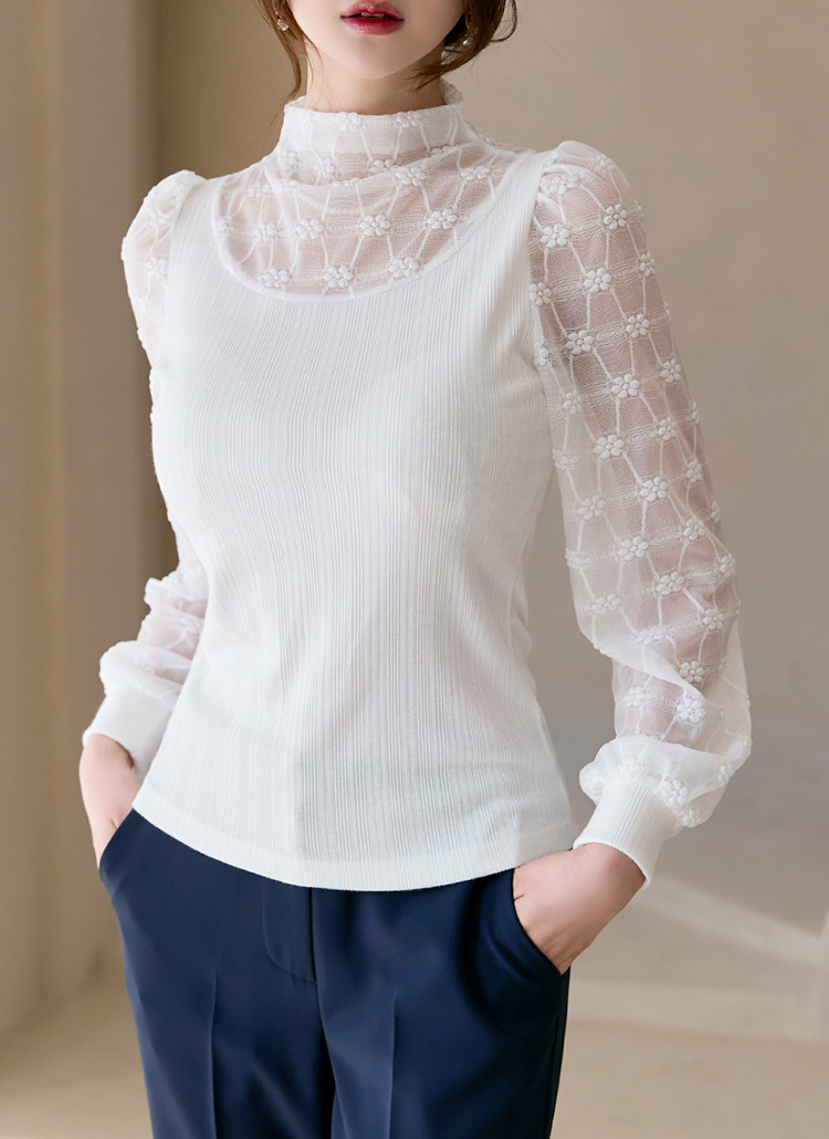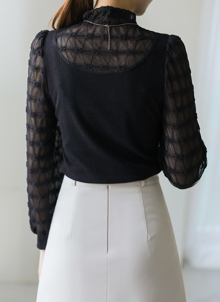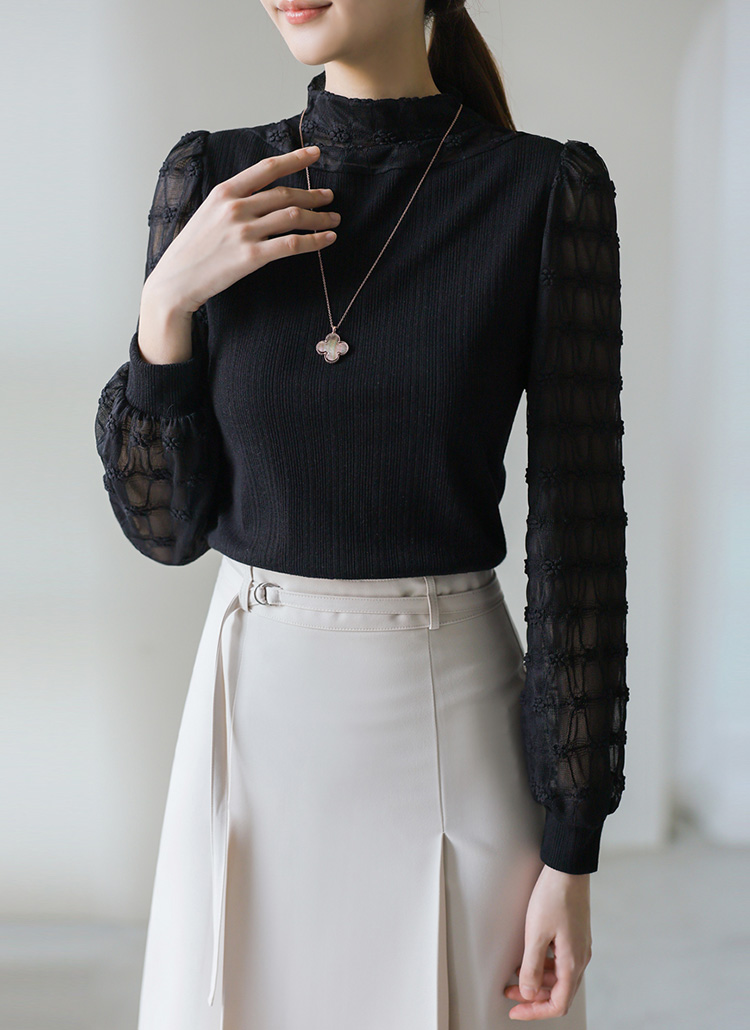 시스루한 소재로 넥과 소매 부분을 배색하여