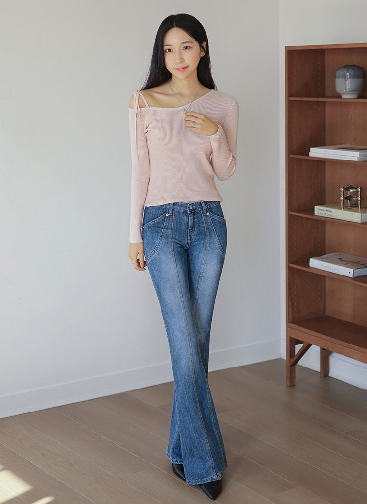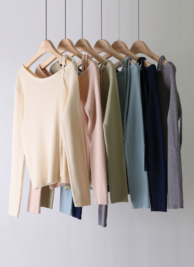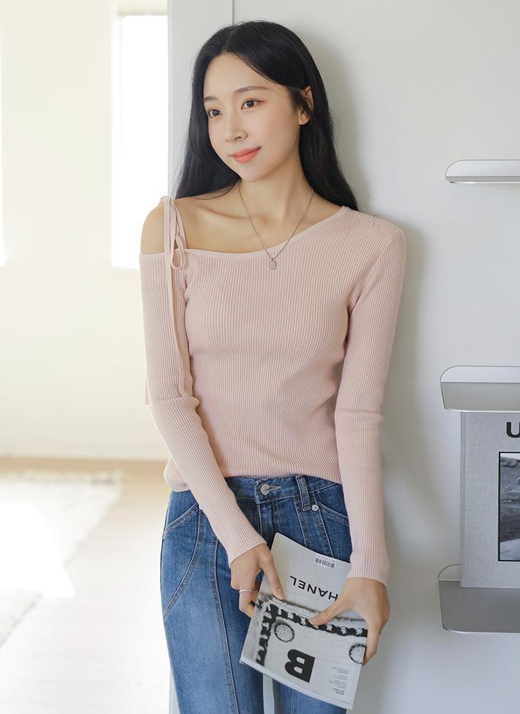 [THE ONME] アシメ オフショルダー リボンストラップ リブニット nt39207