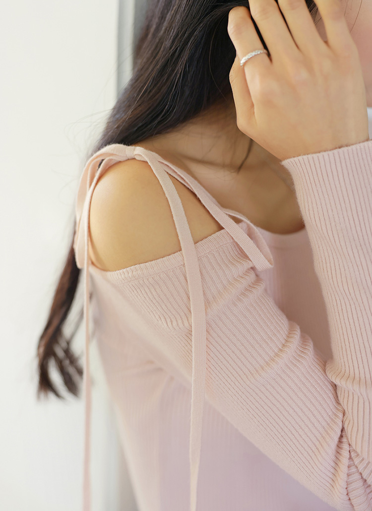 언발 오프숄더 디자인에 리본끈으로 페미닌함이