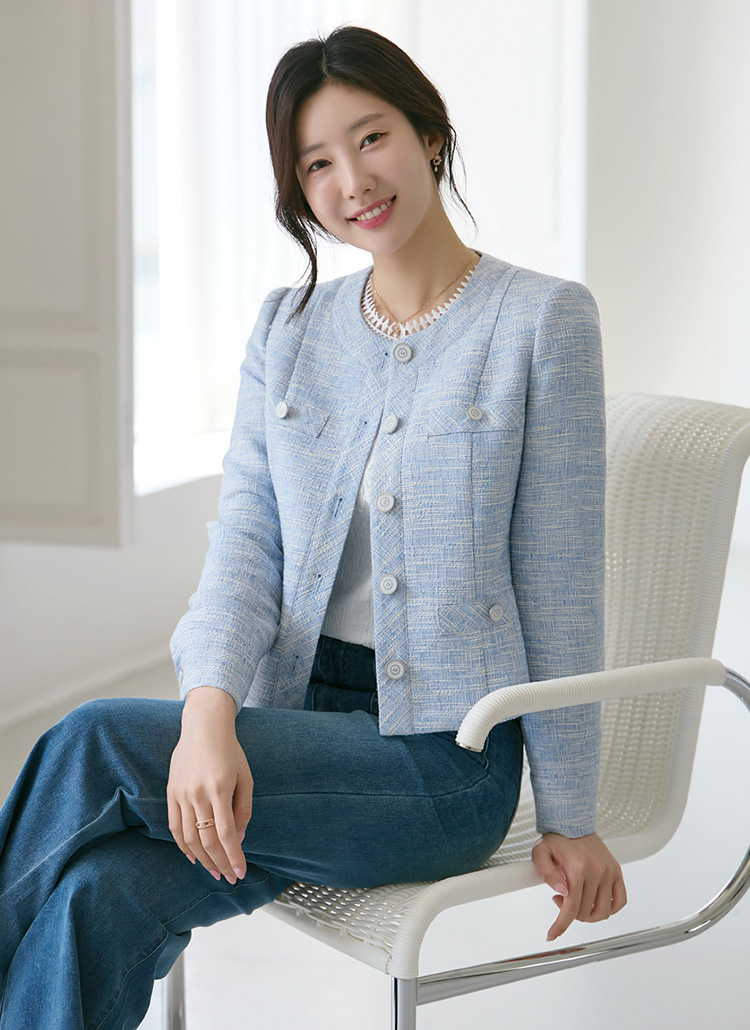 [LouisAngel] スプリングブルーノーカラーツイードジャケットjk39435