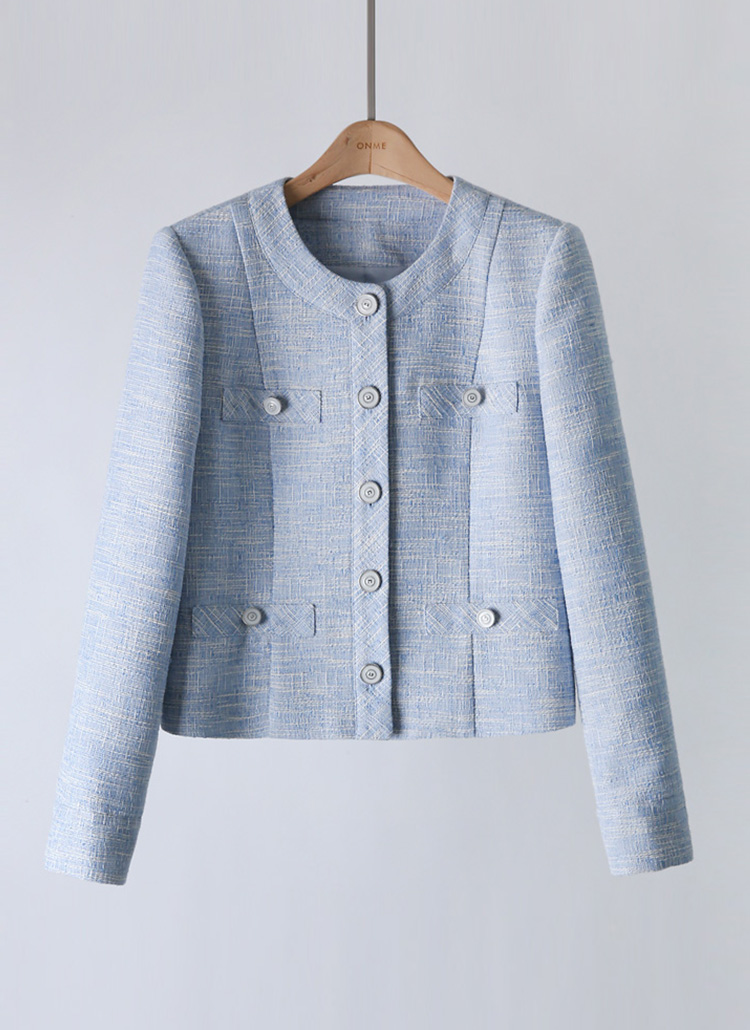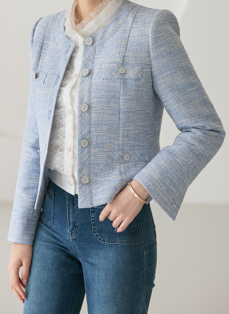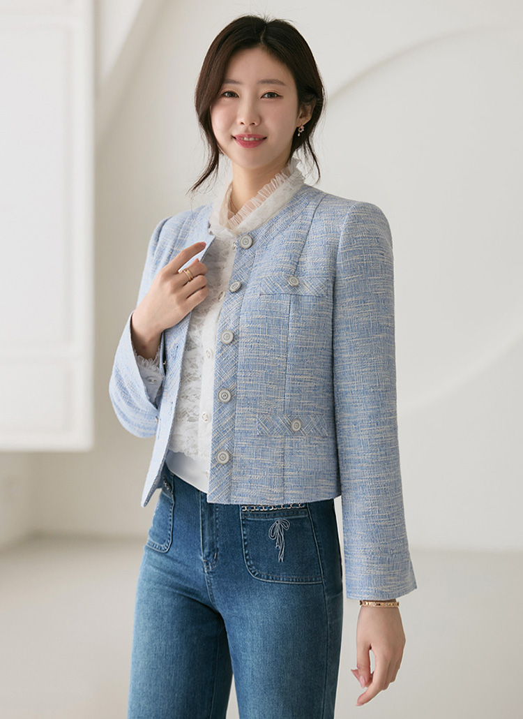 [LouisAngel] スプリングブルーノーカラーツイードジャケットjk39435