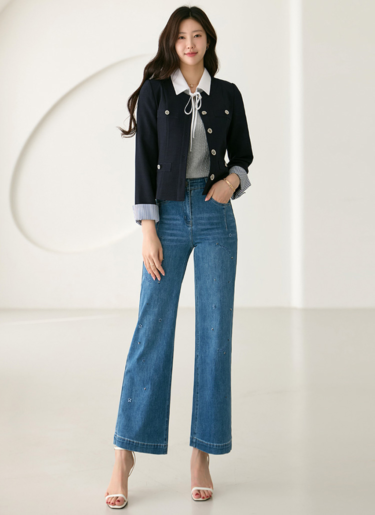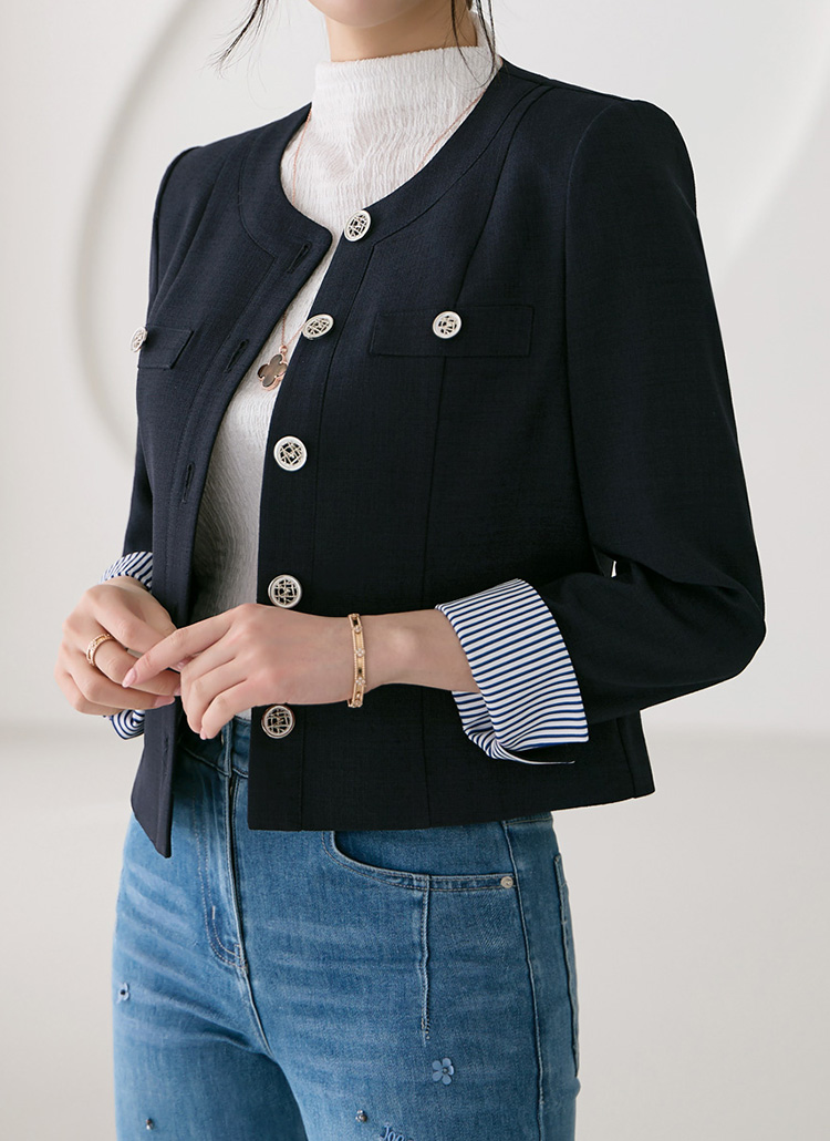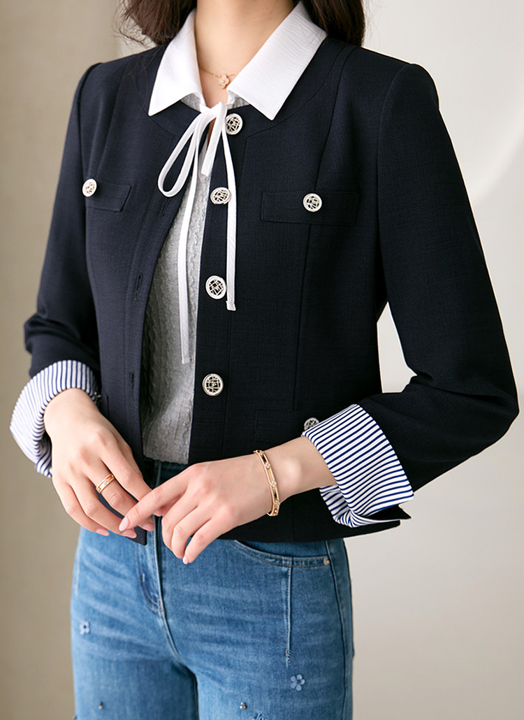 [LouisAngel] 袖ストライプ配色ノーカラーツイードジャケット jk39465