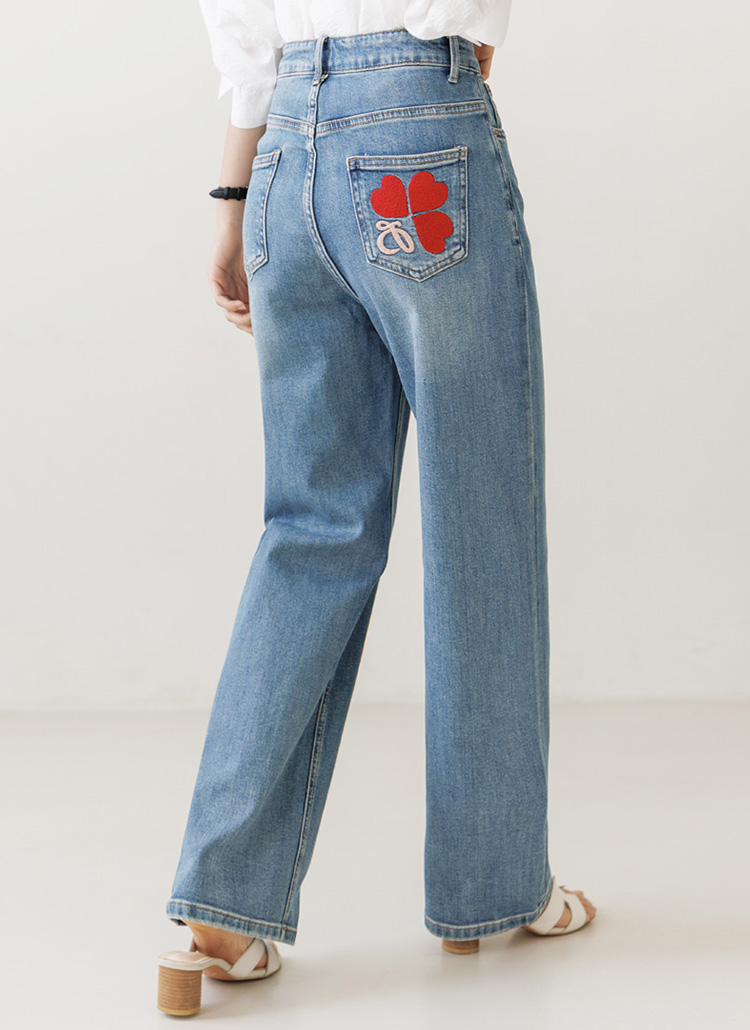 레드 컬러의 하트 자수가 힙 포켓에 화사하고 러블리한 포인트를 준