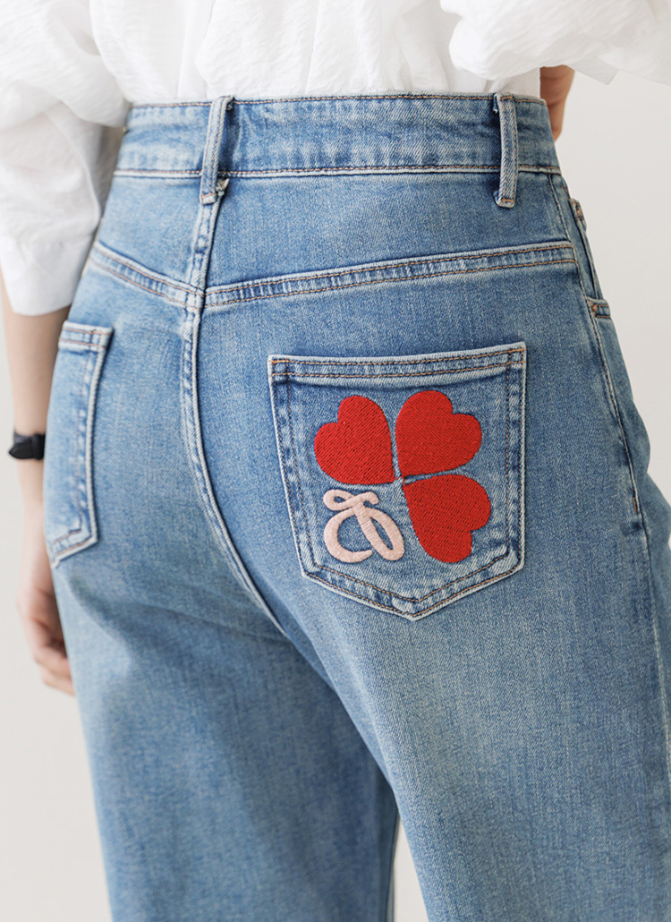 레드 컬러의 하트 자수가 힙 포켓에 화사하고 러블리한 포인트를 준