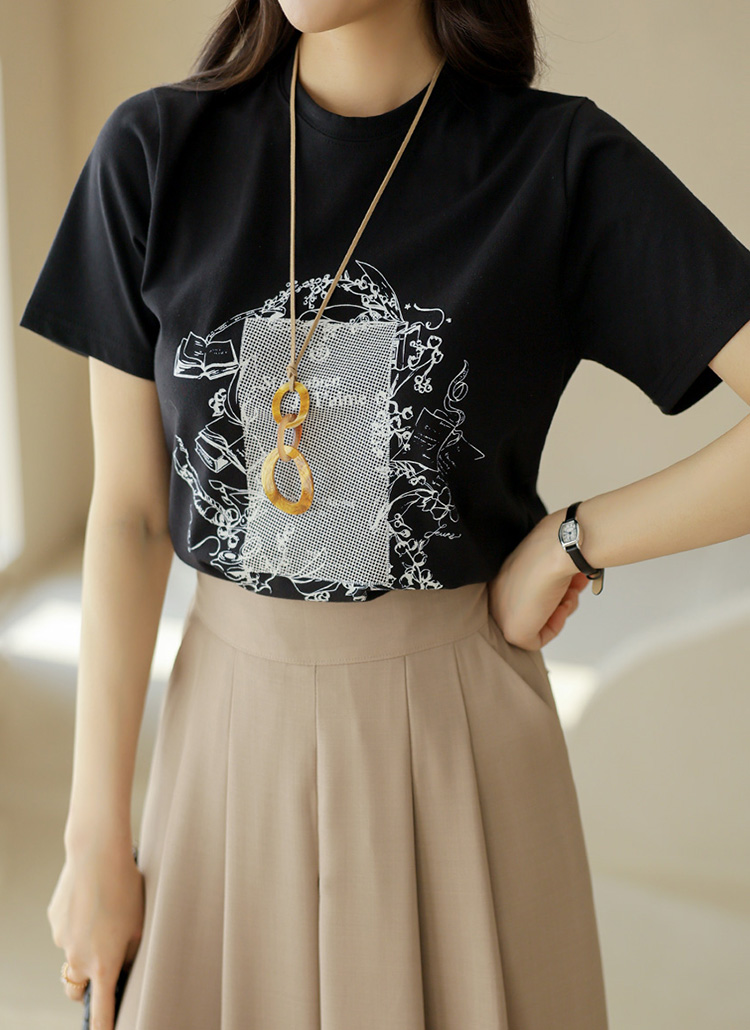 패턴박스에 드로잉이 어우러져 고급지고 에스닉한 무드를 연출하는 프린팅 라운드 반팔 티셔츠에요 :)