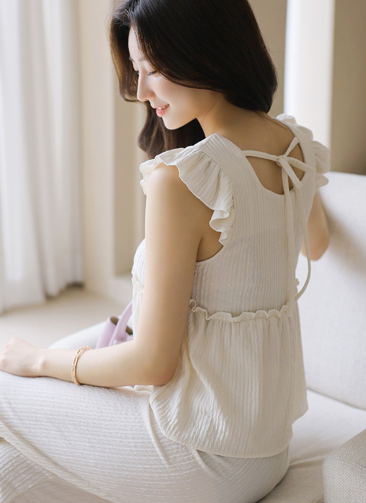 프릴 배색 디테일과 뒷리본으로 사랑스러움이 가득한 톱과