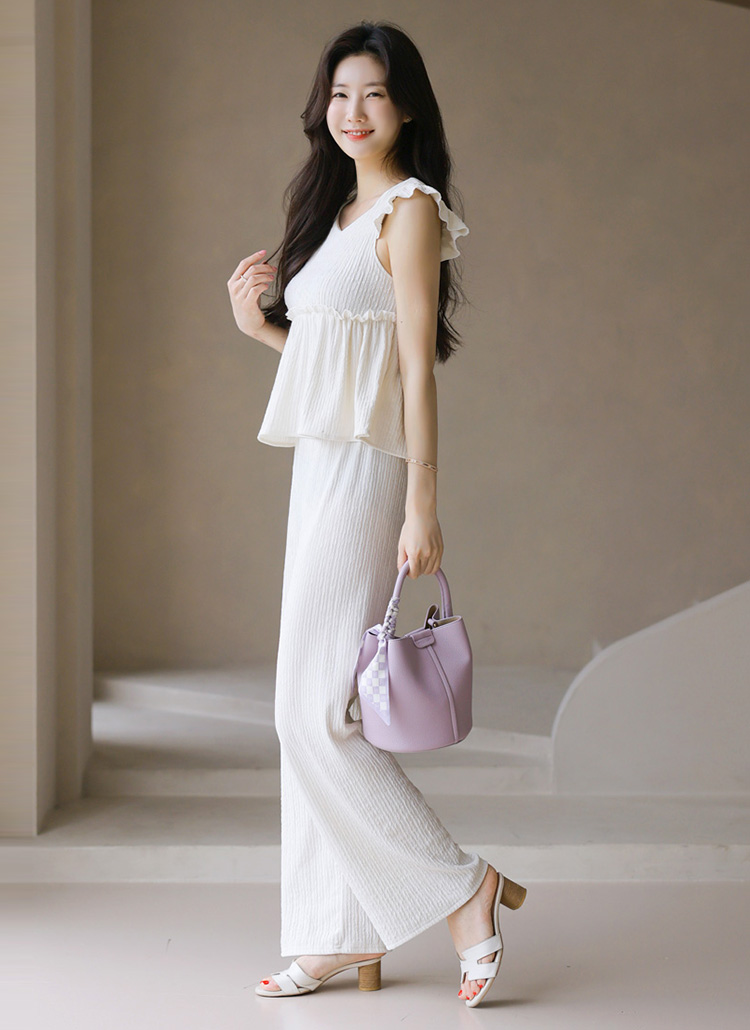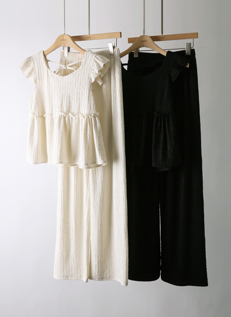 【2点特価】パックリボン付きふくれジャガードフリルTシャツ&ワイドイージーパンツセットアップ SET40599