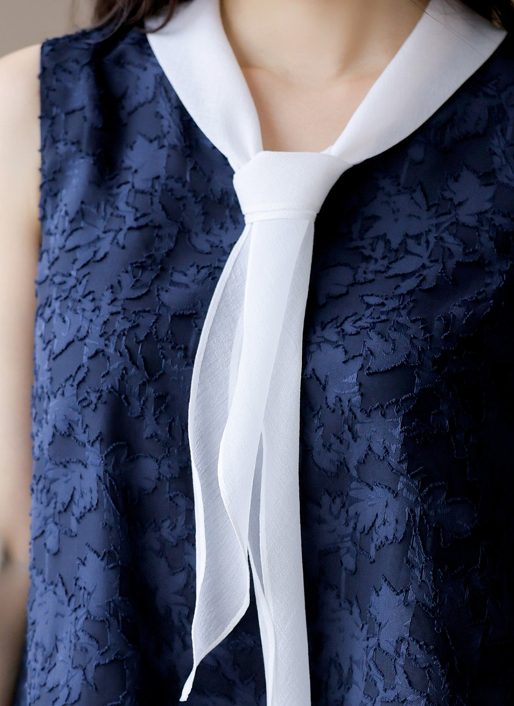 배색으로 들어간 리본타이 넥으로 우아한 페미닌 무드를 선사하는