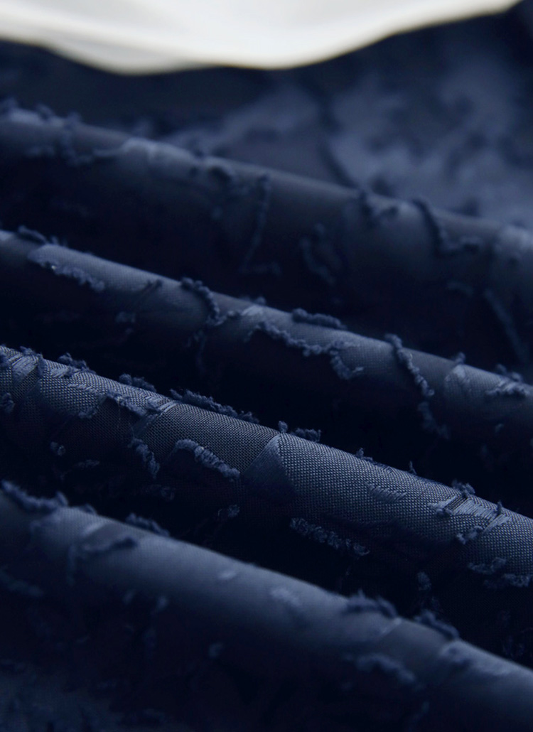 끝단이 풀린 프린지 디테일이 더해져 더 입체적이고 고급스럽게 돋보이는 쟈가드 원단과