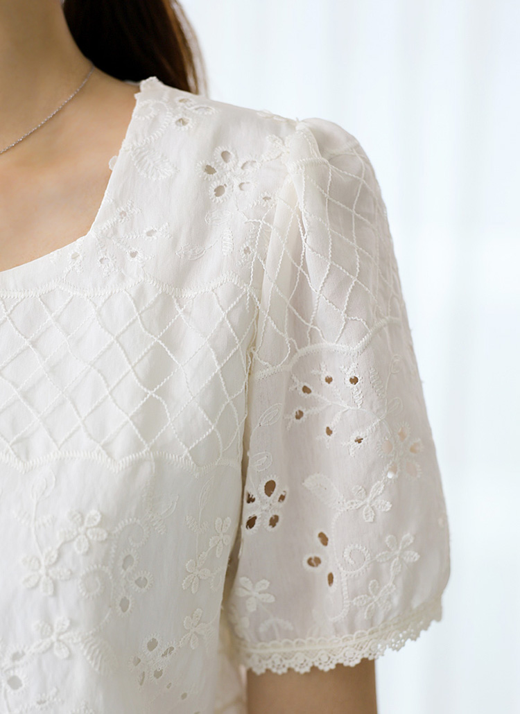 펀칭 아일렛과 플라워 자수로 여름날의 시원함과 에스닉한 매력을 더한