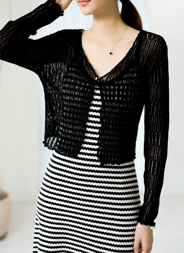 앞면의 심플한 후크 여밈으로 여기저기 가볍게 걸쳐주기 좋은 볼레로 타입 디자인이며