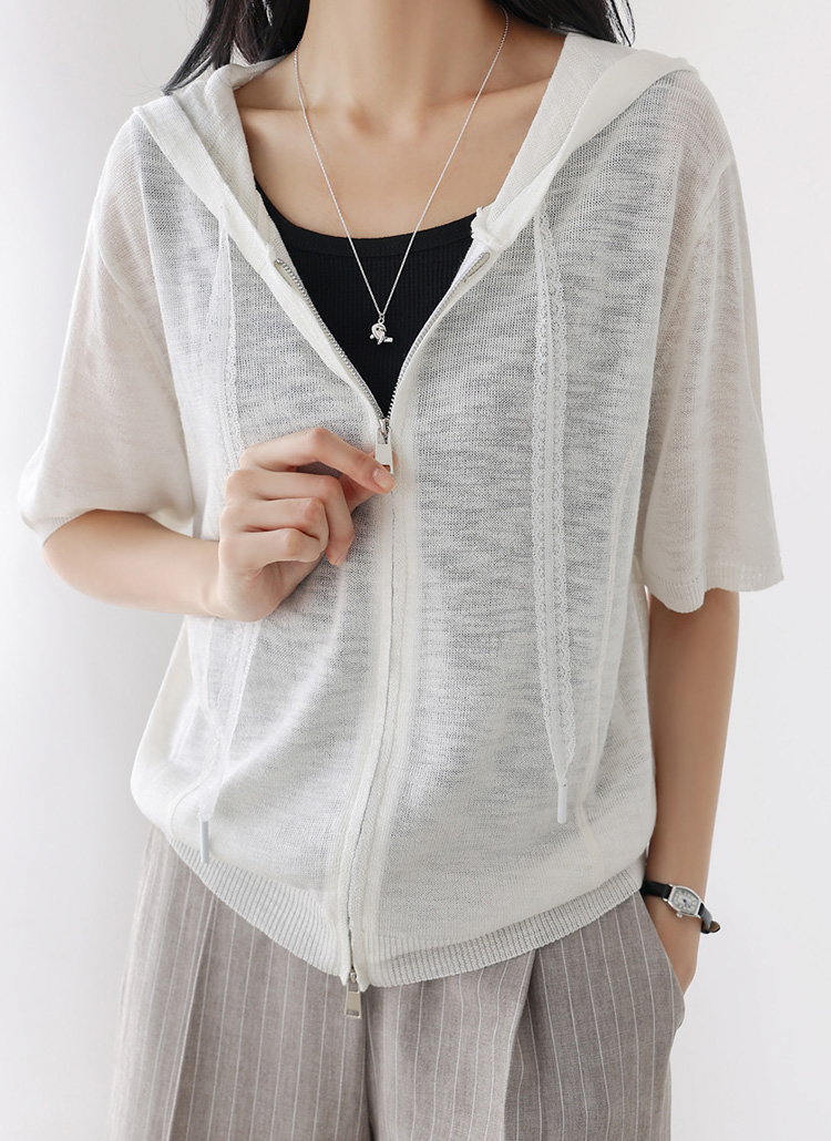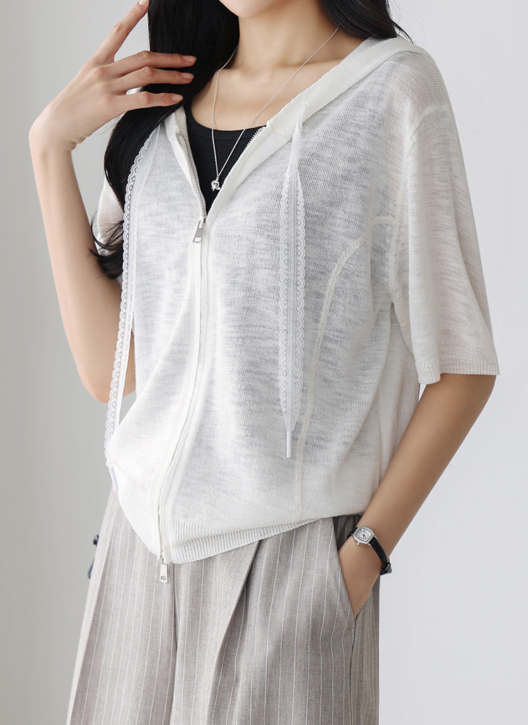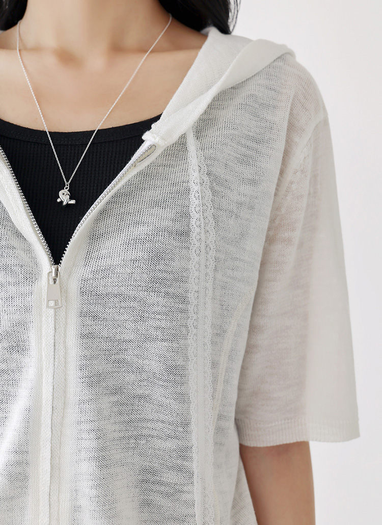 페미닌한 무드의 레이스 후드 끈 시스루 니트 집업이에요 :)