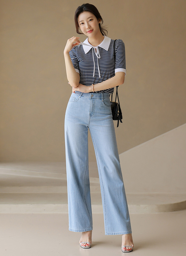리본 카라가 포인트가 되어 여성스러운 분위기를 더해줍니다